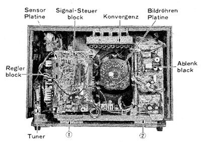 Bild: In Summe 11 Module sind in dem mechanisch zusammenmontierten und herausziehbaren Chassis rund um die 47 cm DELTA-Farbbildröhre integriert. Oben ist die Konvergenzeinheit lokalisiert.