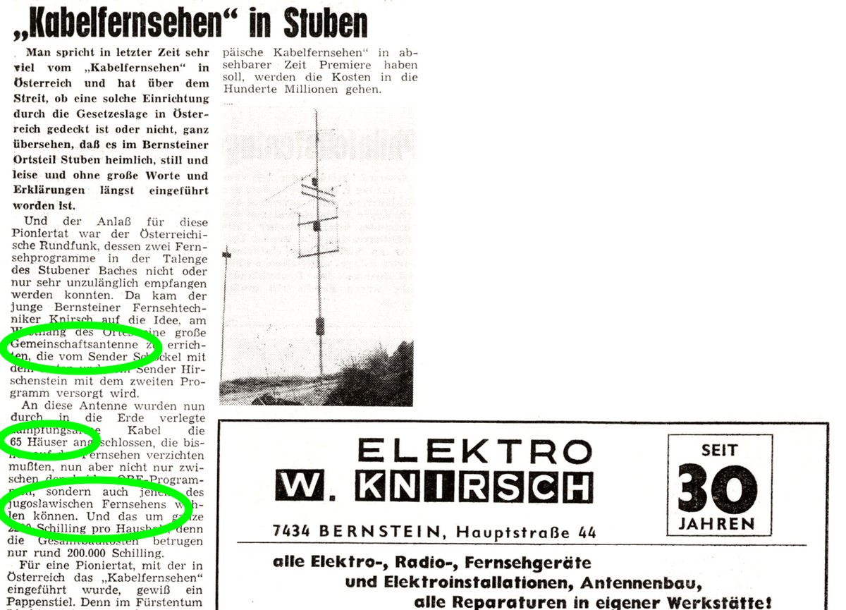 Konkreter wurde es aber tatsächlich erst Anfang der 1970er Jahre als auszugsweise in der Wiener [Rathaus-Korrespondenz] vom 12. März 1975 so ganz zufällig und vermeintlich konsenslos von 10 Fernsehprogrammen für Tessin (Schweiz) die Rede war und eine Richtfunkanbindung für "viele" Großgemeinschaftsantennen die letztlich als Kabelnetzbetreiber fungieren würden geplant war.