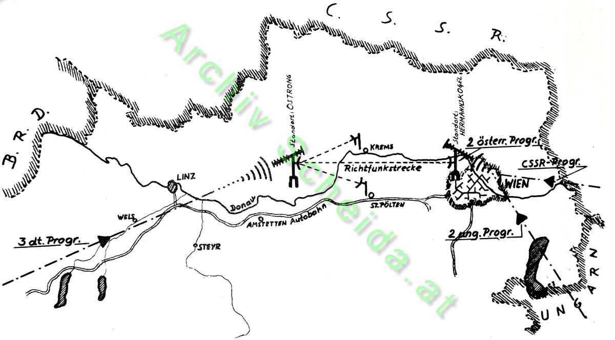 Es sollten herkömmlich terrestrisch die drei deutschen Programme ARD/ZDF/BR3 am Standort Ostrong/NÖ empfangen wurden und als dann aufgeschaltete Richtfunkübertragung nebst Krems und St. Pölten insbesondere Wien an seinem höchst gelegenen Standort am Hermannskogel erreichen.