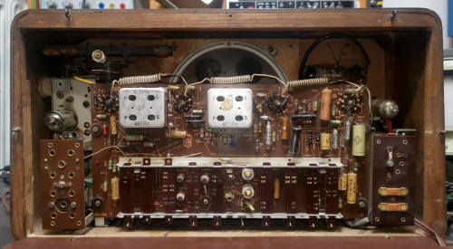 Bild: Rückseitenansicht zu meiner Erinnerung als Kind. Da hatte ich ja auch schon damals andere Röhrenradiochassis autoidaktisch "studiert". Der vollflächige Pertinaxprint der zudem schön beschriftet war mit den beiden Filtergruppen, weiters den zwecks Netzbrummminimierung zusammengedrillten Heizleitungen.