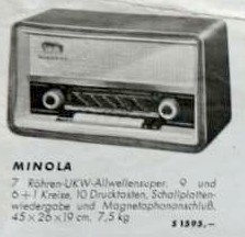 Die Kriegs- wie auch Nachkriegsmodellpalette führte erneut verschiedene Modelle mit dieser Namensgattung an, ehe 1958 dann mit DIESEM hier beschriebenen Gerät die "neue Zeit" der Minola begann.