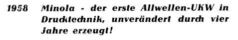 Bild: Auszug aus der MINERVA Darstellung seiner Modellentwicklungen, wonach, und hier ist GENAU zu lesen, der 1958er Minola als der erste U-K-L-M Radio in der damals neuen Printplattentechnik anstelle der bis dahin üblichen Handverdrahtung bei MINERVA gefertigt wurde.