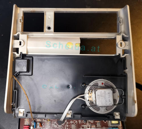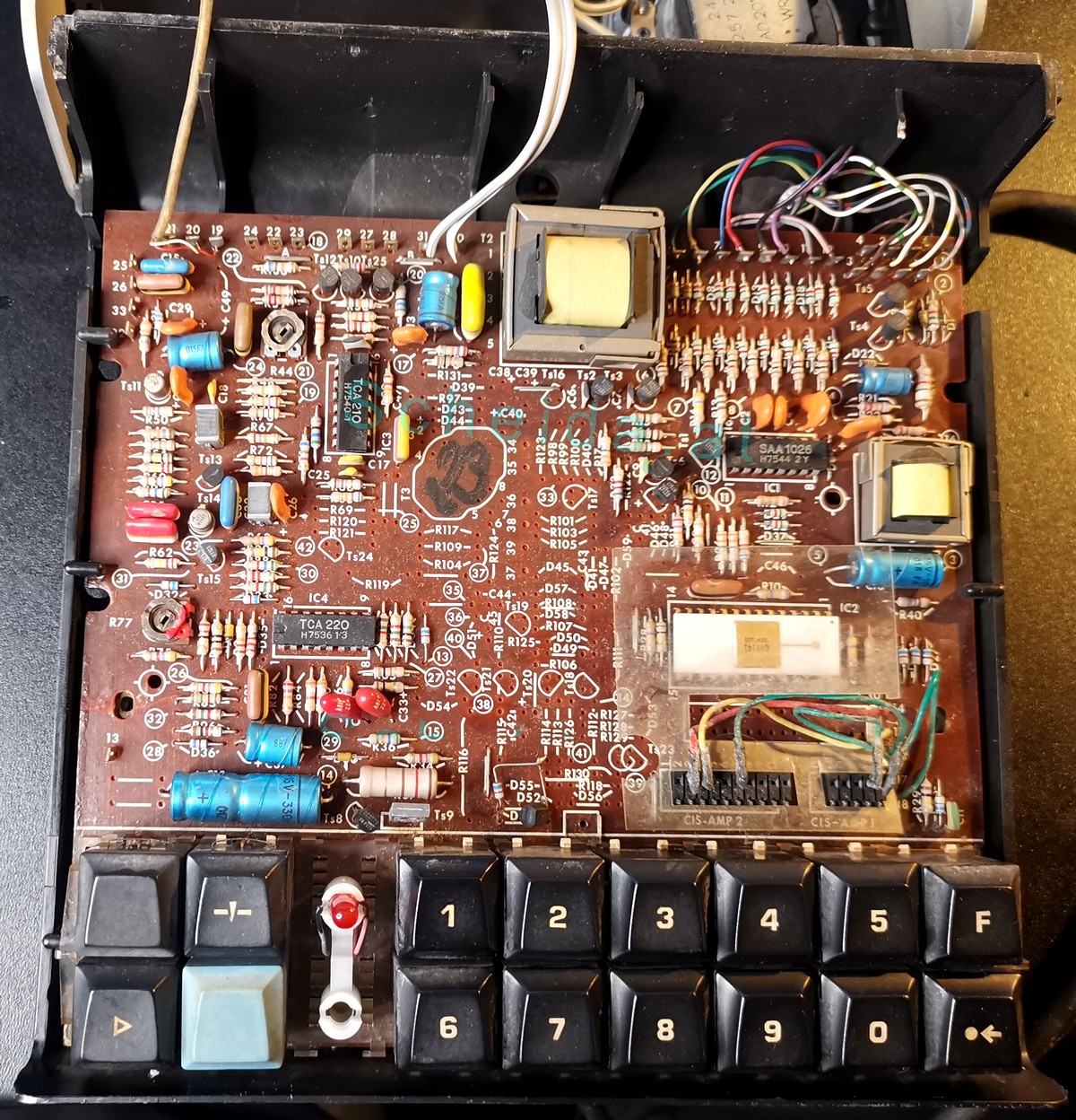 Nach dem Öffnen zeigt sich in den Maßen 195 x 180 mm ein ernsthafter Print mit einem markanten großen Übertrager, einem kleineren Übertrager, ein paar Transistoren, davon einem Leistungstransistor, einem >GYY141< IC womöglich ein EPROM, einem SAA 1026 noch unbekannter Funktion, TCA 210 und TCA220 als Low Power NF Verstärker und OP Kombi IC nebst üblichen passiven Bauteilen.
