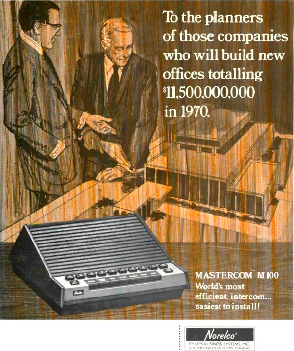 Bild: Als es noch eine Aufbaustimmung in der "It's a mans world" gab. Das vom Philips Tochterunternehmen Norelco in den USA propagierte MASTERCOM M100 System in der 1970er Werbung aus "Electronic Technician 1970-07"