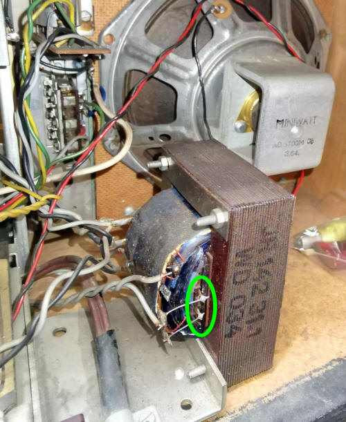 Wir finden einen äußerlich recht bescheiden wirkenden Ausgangsübertrager in der Schnittbandkernbauart vor, der an der Primärseite eine Anzapfung für die gegenphasige Brummkompensation der Betriebsspannung vorhält.