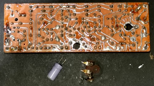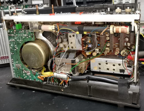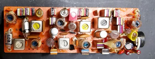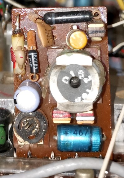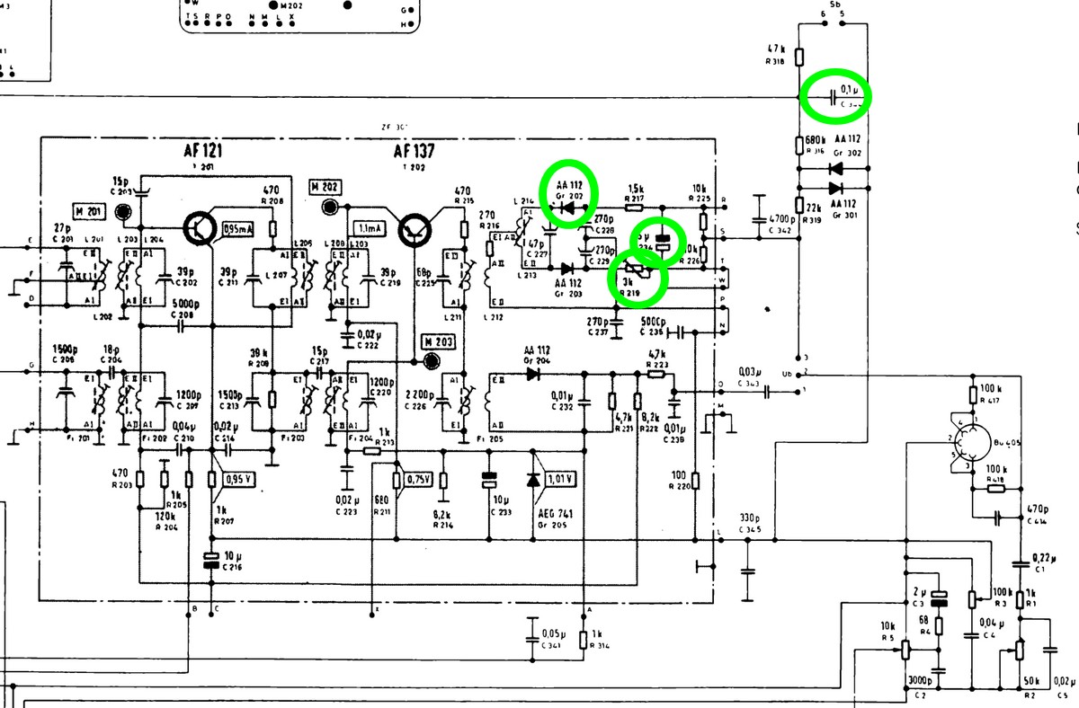 Der 3k Trimmer wurde getauscht. Eine AA112 Demodulatordiode zerbrach sofort beim ersten Berühren und konnte aus dem eigenen Fundus, ca. 600 mV/ 2,3 µA Type ersetzt werden. Widerstände und Kondensatoren wurden gemessen und geprüft ehe wieder alles zusammengebaut und eingelötet wurde.