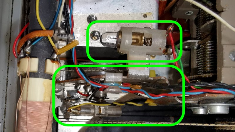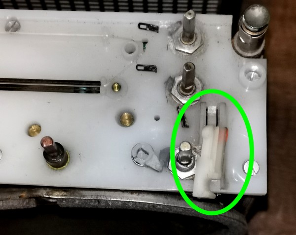 Bild: Die KW-Bandspreizung mechanisch verkoppelt mit der UKW Haupt-Abstimmung sowie das 7V 0,1 A Lämpchen mit Bajonetfassung