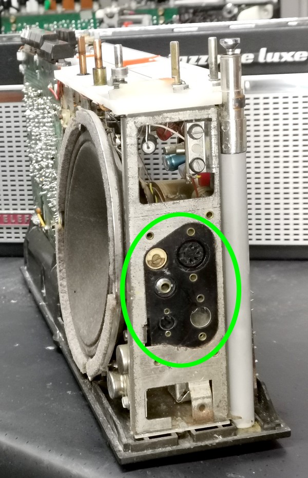 einer 5 pol. DIN Buchse für die Tonband-Aufnahme und Wiedergabe und einem externen Lautsprecher bzw. (Mono-) Ohrhörer