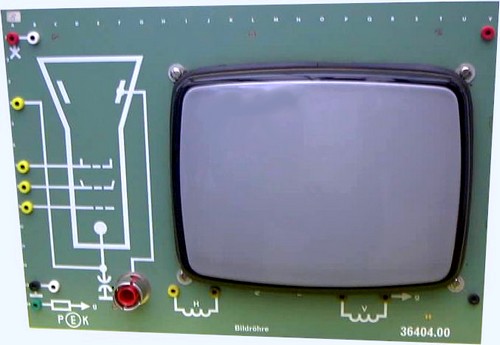 Bild: Symbolbild für einem hier noch in s/w Technik aufgebauten zudem kleineren Fernsehgerätetrainers für Ausbildungs- und Prüfungszwecke auf 10 Schaltplatten um die AW28-13W Bildröhre aus dem Jahr 1968 vom Hersteller PEK-Electronic, Paul E. Klein Electronic; Tettnang.