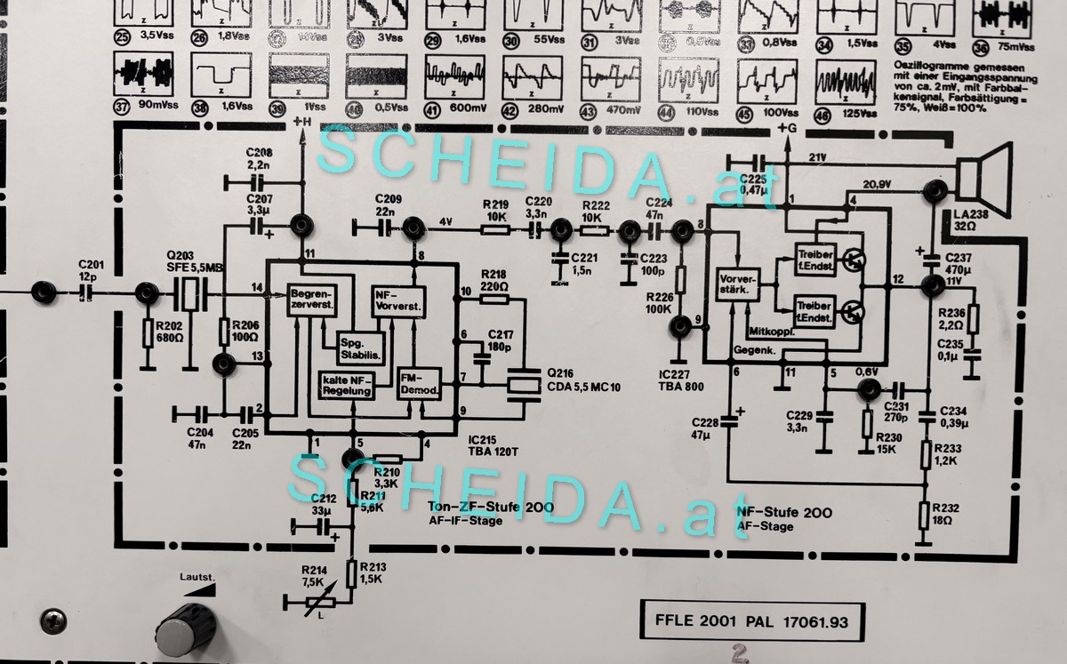 Bild: Am Beispiel der Tonstufe konnten Signale abgenommen werden. Die zu erwartbaren Oszillogramme bzw. Spannungen waren übersichtlich am Gerät aufgedruckt. Dazu gab es den eigentlichen Schaltplan in Papierform.