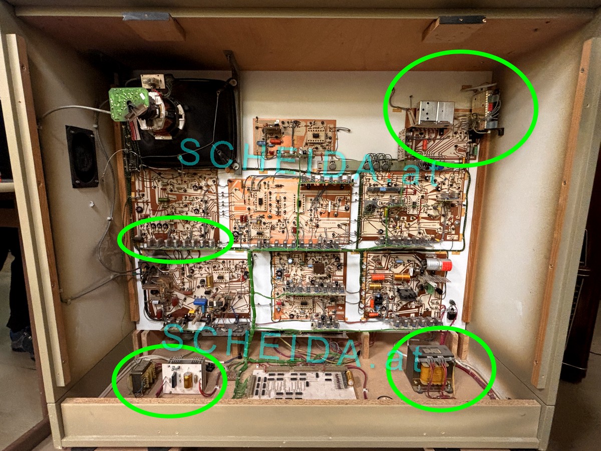 Bild: Rechts oben die Tuner-ZF Baugruppe. Rechts unten der Trenntransformator. Links mitte die Fehlerzuschaltmatrix mit Netzteil dazu unten links.
